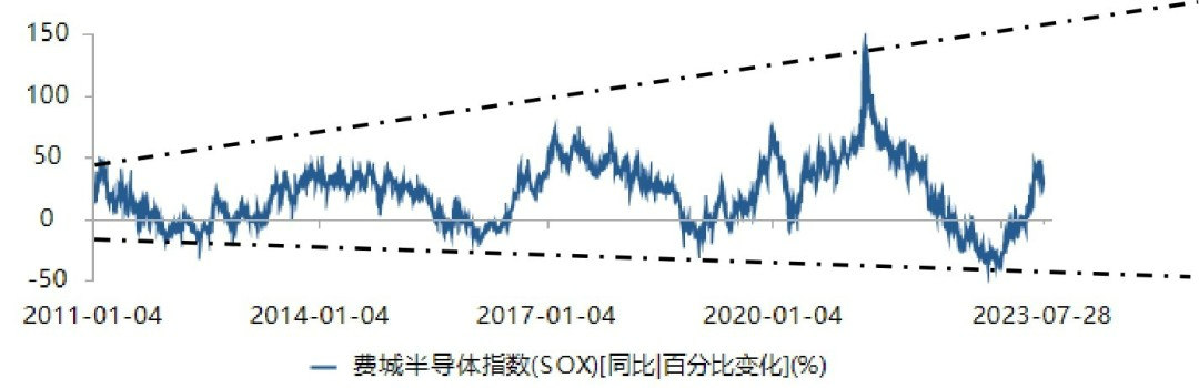 半導體行業具有明顯周期性屬性,一般而言,全球宏觀經濟以及市場供需關系的變化是主導半導體周期的核心因素。近年來新冠疫情暴發、俄烏沖突、通脹攀升等引發世界性的全面經濟衰退,導致全球半導體產業持續承壓。目前,就半導體產業自身固有的周期趨勢所呈現的主要特征:①美國正在推動的、違背規律的供應鏈拆解與割裂,也將帶來全球產業配置與國際貿易的紊亂,導致全球半導體供應鏈體系進入不確定狀態,從而不斷引起半導體行業周期波動的加劇。②在全球貿易收益被顯著壓縮的前提下,半導體企業必然會減少研發支出,結果也勢必抑制全球半導體供應鏈的創新活躍度降低,拉長產品迭代周期,進而成為影響周期變化的不確定因素。根據WSTS發布的2011-2023年全球半導體產業數據進行測算,以3年為周期計算全球半導體產業收入增速的標準差來反映產業波動性,從2011年到2022年這一數值提升了3倍(見圖2)。費城半導體指數作為全球半導體景氣度主要指標之一,其在2011年到2022年的波動情況也日益加劇(見圖3)。