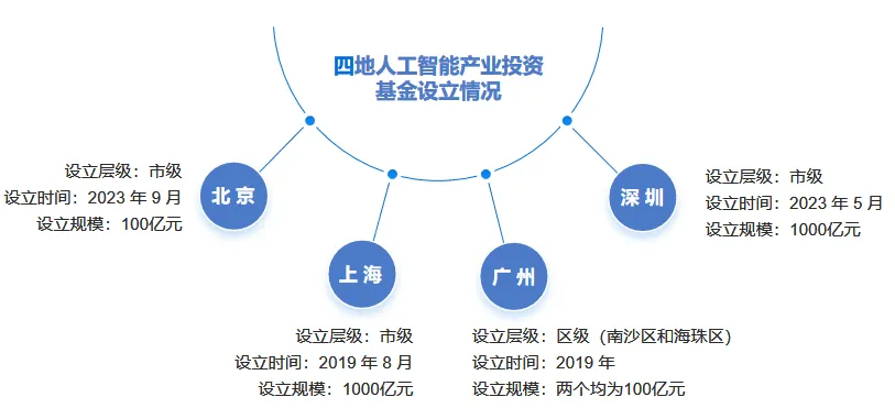四地均設立了不同規模的產業基金,支持人工智能產業能級提升、企業方陣壯大。具體來看,北京、上海和深圳三地設立市級人工智能產業投資基金,廣州市設立區級人工智能產業基金(南沙區和海珠區)。設立時間上,上海市最早于2019年8月設立首期100億元的產業基金,深圳、北京兩地均于2023年設立。基金規模上,上海、深圳兩地人工智能產業基金規模遙遙領先,均達到1000億元。