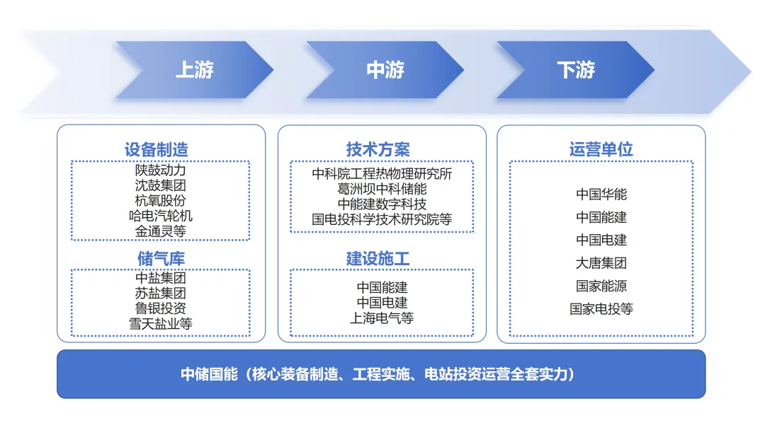 壓縮空氣儲能產(chǎn)業(yè)鏈長、覆蓋廣,上游產(chǎn)業(yè)為設(shè)備制造和儲氣庫,中游為技術(shù)提供及工程建設(shè)方,下游為投資運(yùn)營商(業(yè)主單位),目前在研發(fā)和制造等核心環(huán)節(jié)無卡點(diǎn),基本實(shí)現(xiàn)全環(huán)節(jié)國產(chǎn)化。
