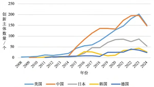 創新主體數量看,整體呈“階梯式躍升-增速回調”特征,中美平分秋色。2008—2013年為技術萌芽期,年均新增主體不足15家;2014年起隨資本涌入與技術成熟度提升進入爆發增長期(2014—2017年CAGR達63.8%),2017年突破300家;2018—2023年增速趨緩但仍維持高位(CAGR 15.8%),2023年達到782家的峰值。2024年創新主體數量首次出現負增長,預示行業進入技術路線收斂、市場出清與頭部集中化的關鍵調整期,從“野蠻生長”轉向“高質量發展”階段(圖3)。從各國看,自2014年起,我國創新主體數量快速增長,連續多年領跑全球。美國作為eVTOL領域研究的先行者,其創新主體規模保持穩定高增長態勢,憑借技術先發優勢持續鞏固全球主導地位。日本、韓國和德國的創新主體數量雖維持增長態勢,但受限于市場規模和產業水平,與中美兩國的總量差距持續擴大,eVTOL產業的發展潛力難以與中美兩國相比較(圖4)。