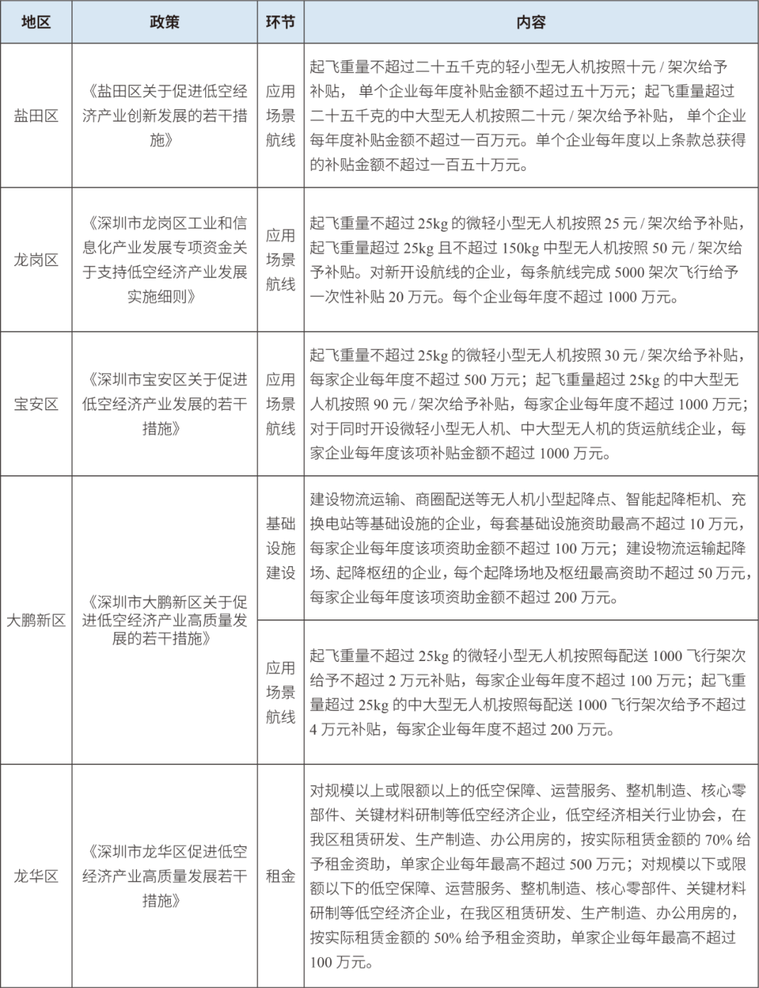 一是謀劃低空經(jīng)濟(jì)頂層設(shè)計(jì)。作為經(jīng)濟(jì)特區(qū),深圳充分發(fā)揮獨(dú)立立法權(quán)出臺(tái)了《深圳市民用無人機(jī)管理暫行辦法(征求意見稿)》等政策法規(guī),從民用無人機(jī)管理、適航認(rèn)證、通航協(xié)調(diào)等方面為無人機(jī)物流發(fā)展提供立法保障。深圳市通過設(shè)立專項(xiàng)資金、給予建設(shè)與運(yùn)營補(bǔ)貼、貼息貸款等方式為無人機(jī)相關(guān)企業(yè)提供資金支持;對(duì)于新入駐各區(qū)低空產(chǎn)業(yè)園區(qū)的企業(yè),提供租金補(bǔ)貼,吸引核心零部件企業(yè)落地生產(chǎn)。