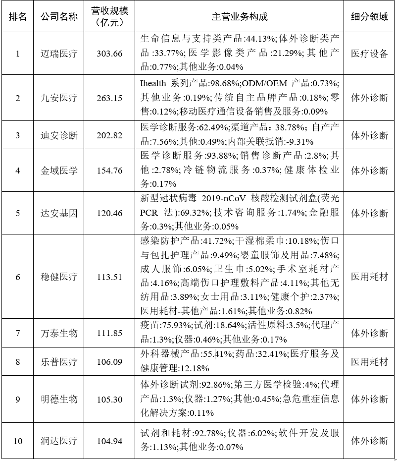 圖2 中國A股醫療器械產業各年上市企業數量 從上市時間看,近三年高峰涌現。自2011年起,醫療器械企業上市活躍度逐漸上升,2020-2022年國內醫療器械行業迎來上市熱潮,三年間上市企業合計數量占總數的比重達到近一半,其中體外診斷企業上市表現尤為突出,三年合計上市23家;2022年醫療設備類企業成為上市主力,有11家相關企業上市。 從所屬地域看,南方地區活躍度較高。廣東省上市企業29家,江蘇省上市企業19家,上海市上市企業18家,浙江省上市企業11家,以上四地上市企業占全國總數的55.8%。北方地區以北京市、山東省兩地較為突出,北京市上市企業18家,山東省上市企業10家,兩地上市企業占全國20.3%。 二、經營分析 (一)醫療器械行業實現穩健增長,2022年營業收入同比增長約24.5% 2022年,醫療器械上市公司業績穩健增長,138家醫療器械上市公司實現營業收入達4139億元,其中體外診斷領域約2181億元、醫療設備領域約1011億元、醫用耗材領域約944億元,相比2021年醫療器械上市公司實現的營業收入總額3324億元,增長約24.5%。在過去三年,醫療器械行業受抗疫帶來的需求推動、實施分級診療政策導致的采購需求增加、國產化替代進程加速等多方面積極影響,呈現了蓬勃發展的態勢。 具體來看,其中有94家企業實現了營業收入同比增長,占比68.1%,其中有7家企業實現營業收入翻倍:九安醫療(997.8%)、安旭生物(287.97%)、明德生物(272.12%)、亞輝龍(237.95%)、蘭衛醫學(136.13%)、怡和嘉業(113.64%)、凱普生物(109.39%)。除了怡和嘉業為醫療設備類企業外,其余均為體外診斷類企業。 有44家企業營業收入同比下滑,其中有11家來自體外診斷領域,17家來自醫用耗材領域,15家來自醫療設備領域。其下滑的主要原因: 體外診斷領域:由于新冠檢測試劑產品在國內外市場競爭日益激烈,導致新冠抗原檢測試劑產品的銷售需求和單價顯著下降,對公司業績產生巨大負面影響。 醫用耗材領域:受新冠事件影響,全球對一次性防護產品的需求激增。然而,2022年供需關系和市場環境發生巨大變化導致產能過剩。中小廠商之間的價格競爭促使終端價格回落至常態化水平甚至更低,因而醫用耗材企業的營業收入同比下滑。 醫療設備領域:受國際局勢影響,醫療設備行業長期處于能源短缺、全球物流效率大幅下降和供應緊缺的態勢中,導致全球芯片及電子元器件等關鍵物料的價格大幅上漲。此外,消費端需求釋放減緩并出現結構化升級等因素也對醫療設備企業的業績產生了影響。 表1 2022年我國醫療器械上市企業營收規模TOP10