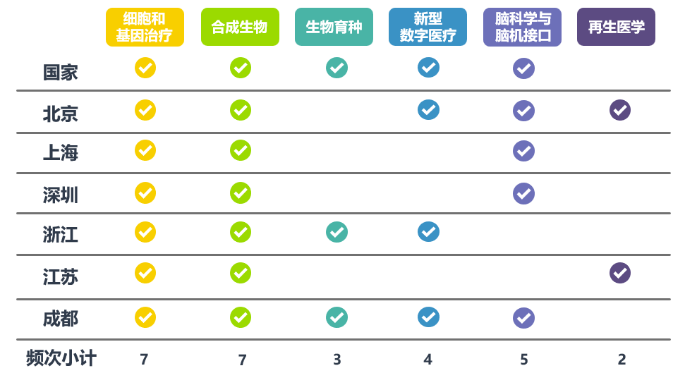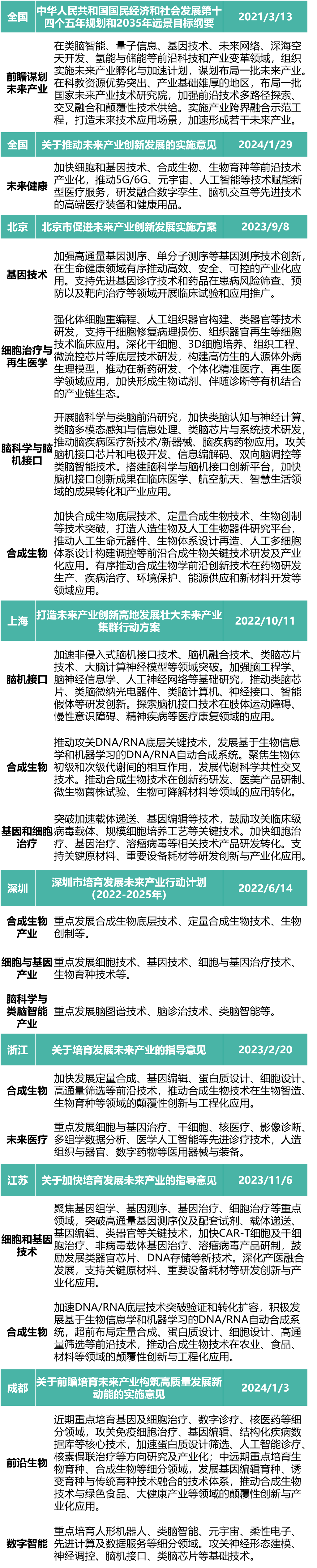 自國(guó)家“十四五”規(guī)劃綱要提出要前瞻謀劃未來(lái)產(chǎn)業(yè)以來(lái),各地高度重視并加快未來(lái)產(chǎn)業(yè)的系統(tǒng)謀劃與前瞻布局。北京、上海、成都、浙江、江蘇等地陸續(xù)出臺(tái)了相關(guān)指導(dǎo)意見、行動(dòng)方案(詳見附表)。圍繞未來(lái)健康產(chǎn)業(yè),均提出了要加快布局細(xì)胞與基因治療、合成生物學(xué)等領(lǐng)域新賽道。部署重點(diǎn)領(lǐng)域情況如下: