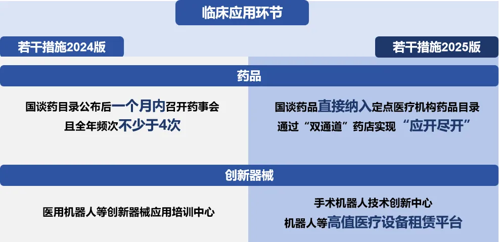 創(chuàng)新藥方面,相較于上海、廣東等地增加召開(kāi)藥事會(huì)頻次,北京率先提出國(guó)談藥可直接納入全市定點(diǎn)醫(yī)療機(jī)構(gòu)藥品目錄,無(wú)需召開(kāi)藥事會(huì),醫(yī)療機(jī)構(gòu)可通過(guò)“雙通道”藥店實(shí)現(xiàn)“應(yīng)開(kāi)盡開(kāi)”。此外,支持醫(yī)療機(jī)構(gòu)針對(duì)創(chuàng)新價(jià)值高但臨床數(shù)據(jù)較少、實(shí)際證據(jù)不充分的藥物開(kāi)展真實(shí)世界研究,驗(yàn)證藥物臨床價(jià)值。創(chuàng)新醫(yī)療器械方面,搭建機(jī)器人等高值醫(yī)療設(shè)備租賃平臺(tái),運(yùn)用市場(chǎng)化方式打通創(chuàng)新醫(yī)療器械入院“最后一公里”,破解創(chuàng)新醫(yī)療器械高成本與推廣難的矛盾,加快手術(shù)機(jī)器人入院應(yīng)用和創(chuàng)新迭代。